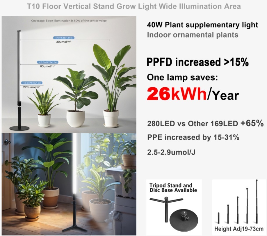 Luonnollinen täysspektri F101 sisäkasveille. Säädettävä jalusta ja kulmansäätö. Kevyt, huoleton ja hiljainen ilman tuulettimia. Toimii suoraan pistorasiasta (AC 200–240 V). CE, RoHS ja FCC-vaatimustenmukainen.